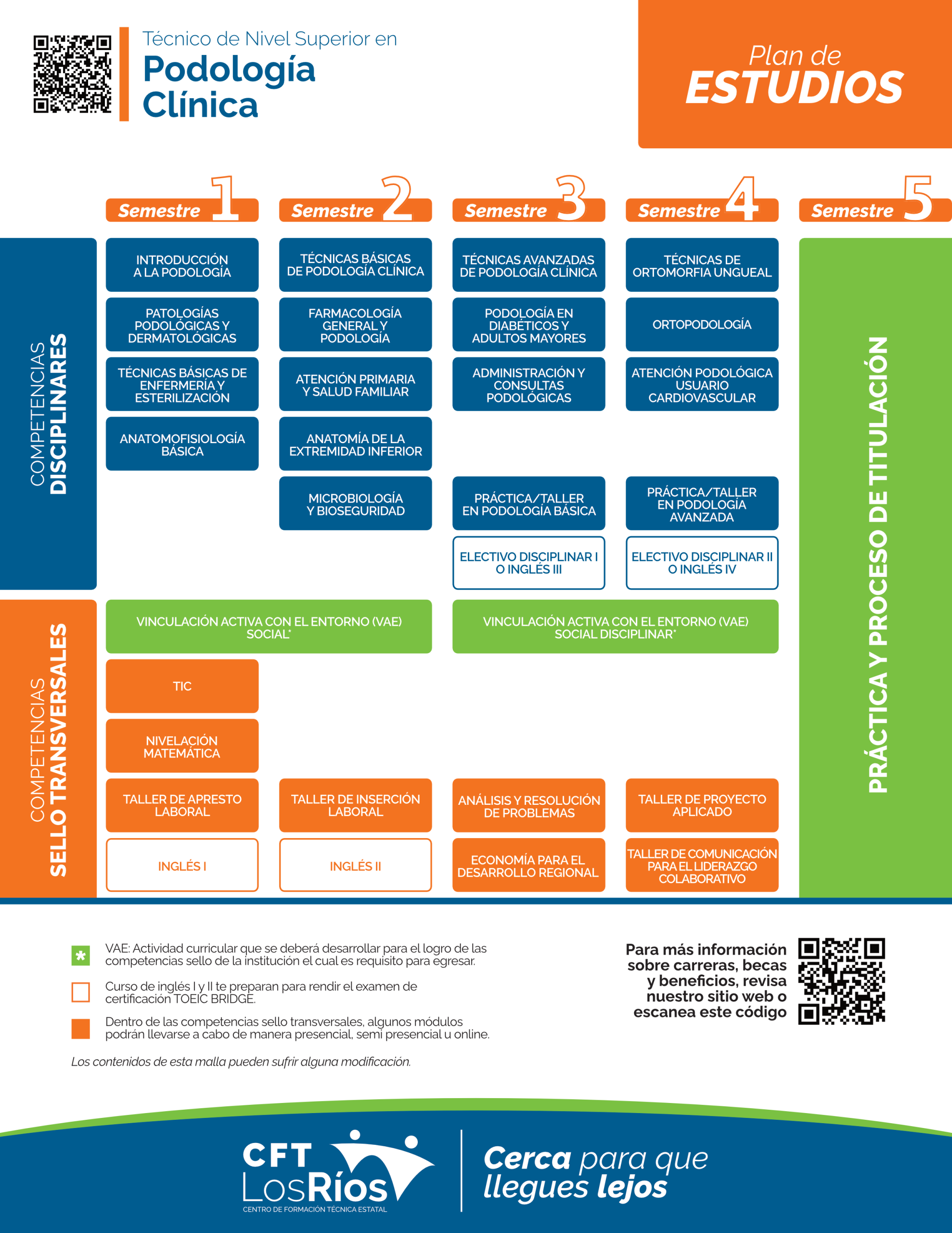 El/La Técnico Nivel Superior en Podología Clínica, titulado del Centro de Formación Técnica de Los Ríos, será capaz de realizar la evaluación, diagnóstico y tratamiento podológico de personas de diferentes grupos etarios, aplicando técnicas y procedimientos básicos y avanzados, tanto en atención primaria como en centros de salud privados. En este sentido, tendrá dominio de las patologías podológicas, dermatológicas y con mayor prevalencia que afectan la salud del pie, aplicando tratamiento según las normativas de bioseguridad, calidad y normas de prevención, y control de infecciones asociadas a la atención en salud, con foco en la bioética, programas y políticas públicas que propicien una buena atención a las personas. Además, a modo de prevención y promoción de la salud, el TNS en Podología Clínica desarrolla actividades educativas para los usuarios, con el objetivo de fortalecer capacidades de autocuidado en las personas y las comunidades.